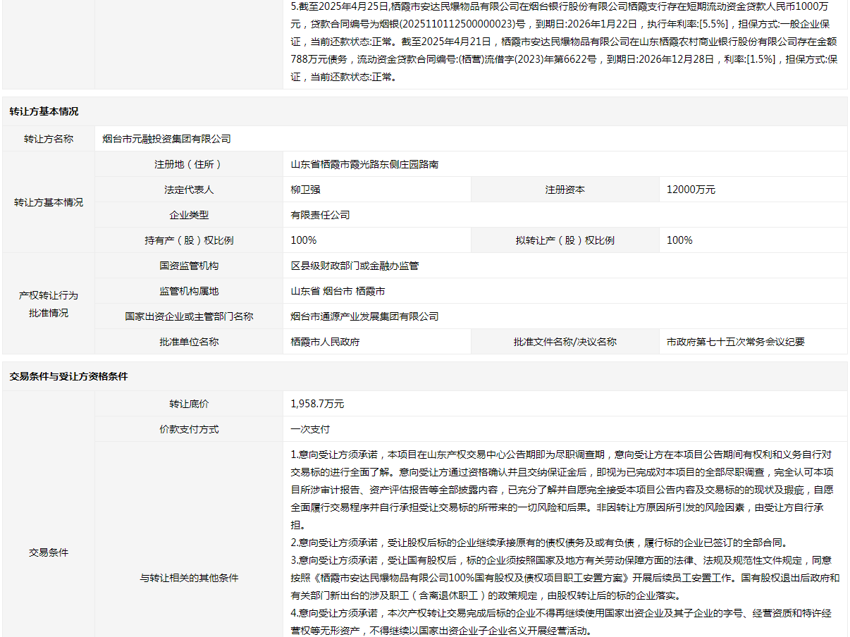 棲霞市安達(dá)民爆物品有限公司100%國(guó)有股權(quán)及債權(quán)
