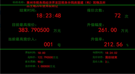 近日,萊州市稅務(wù)局經(jīng)濟(jì)開發(fā)區(qū)稅務(wù)分局所屬房屋建筑物及所占土地20年使用權(quán)轉(zhuǎn)讓項(xiàng)目在煙臺產(chǎn)權(quán)掛牌并有多個意向受讓方報名,最終,經(jīng)過72輪激烈報價,項(xiàng)目較掛牌底價122萬元,增值261萬元,增值率高達(dá)212.56%,不但保證了疫情期間國有產(chǎn)權(quán)業(yè)務(wù)的正常開展,而且?guī)椭a(chǎn)權(quán)持有人實(shí)現(xiàn)了價值最大化。
