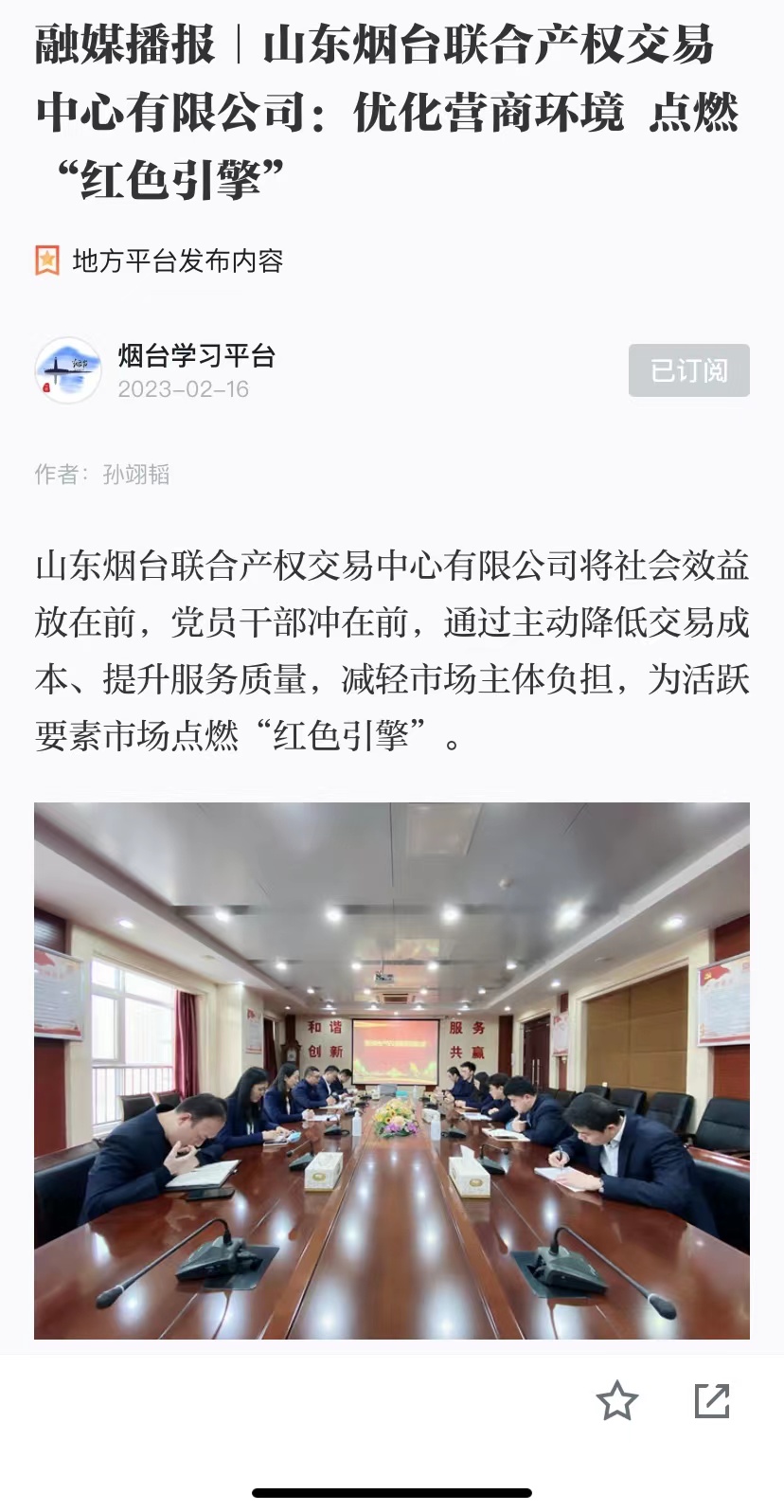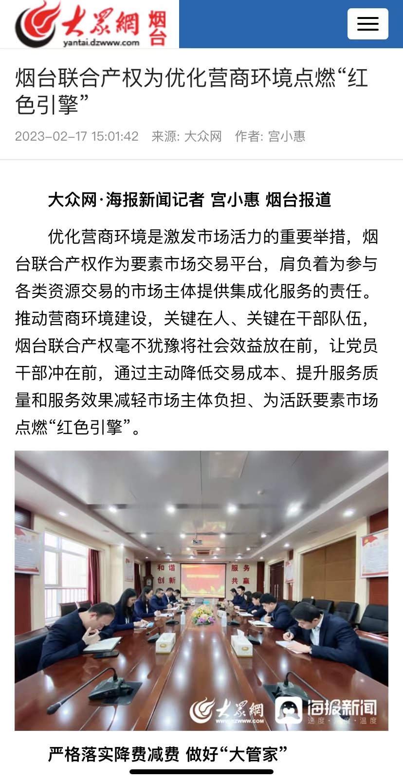 近日,“學習強國”煙臺平臺、煙臺日報社大小新聞網(wǎng)、大眾網(wǎng)煙臺刊發(fā)署名文章《煙臺聯(lián)合產(chǎn)權(quán)為優(yōu)化營商環(huán)境點燃“紅色引擎”當好市場“店小二”》,全面介紹了2022年煙臺聯(lián)合產(chǎn)權(quán)作為要素市場交易平臺,肩負著為參與各類資源交易的市場主體提供集成化服務的責任,在推動營商環(huán)境建設方面,毫不猶豫將社會效益放在前,讓黨員干部沖在前,通過主動降低交易成本、提升服務質(zhì)量和服務效果減輕市場主體負擔、為活躍要素市場點燃“紅色引擎”。