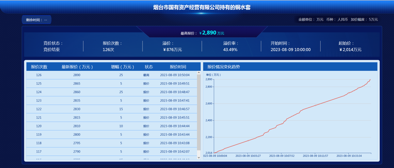 8月9日,煙臺市國有資產經營有限公司持有的銅水套項目通過網絡競價的方式公開競價,18名意向受讓方經過126次激烈競價,最終以2890萬元的價格成交,溢價876萬元,溢價率43.49%。